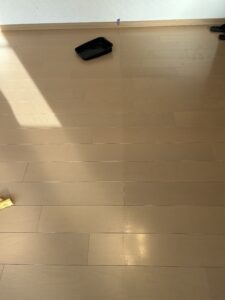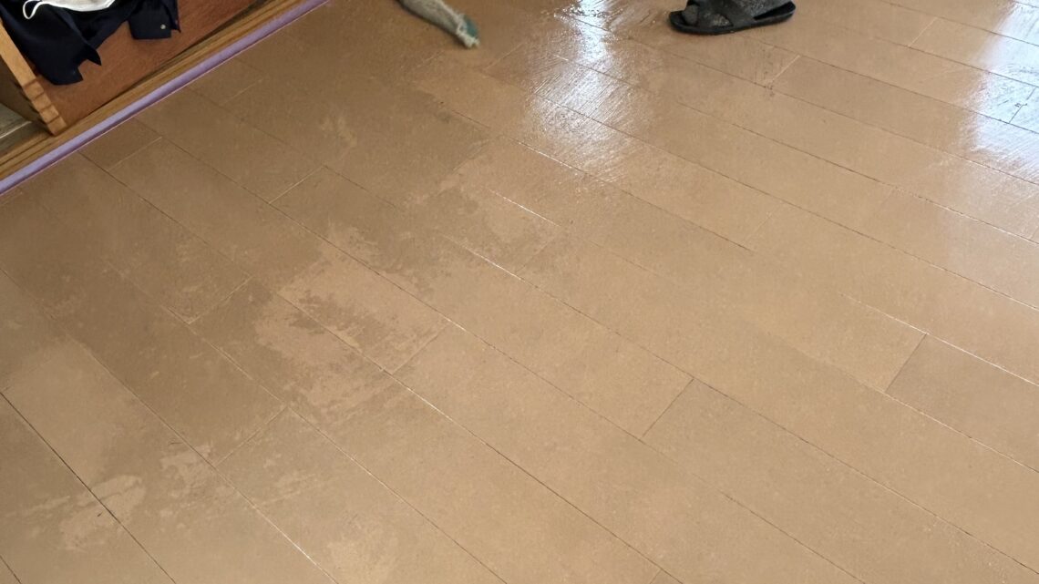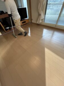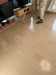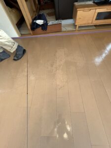 写真の左側がワックス剥離後 ワックス剥離剤を塗布してます